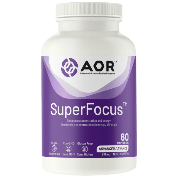 SuperFocus d’AOR fournit des extraits végétaux cliniquement testés tels que la rhodiola, le bacopa et le Panax ginseng pour stimuler la vigilance. Ce produit contient également de la caféine isolée du thé vert qui améliore la concentration, et de l’acide aminé L-théanine qui procure des effets calmants.